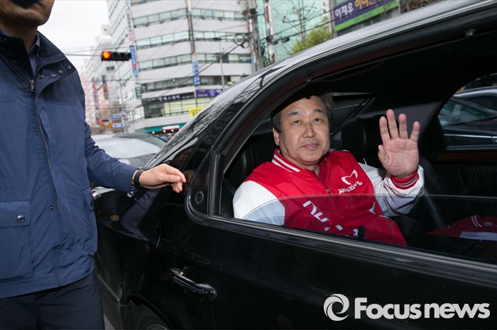 (김해=포커스뉴스) 김무성 새누리당 대표가 4일 오후 경남 김해시 내외로 외동전통시장 앞에서 이만기 김해을 후보 지원유세를 마친 뒤, 차에 오르며 손을 흔들고 있다.