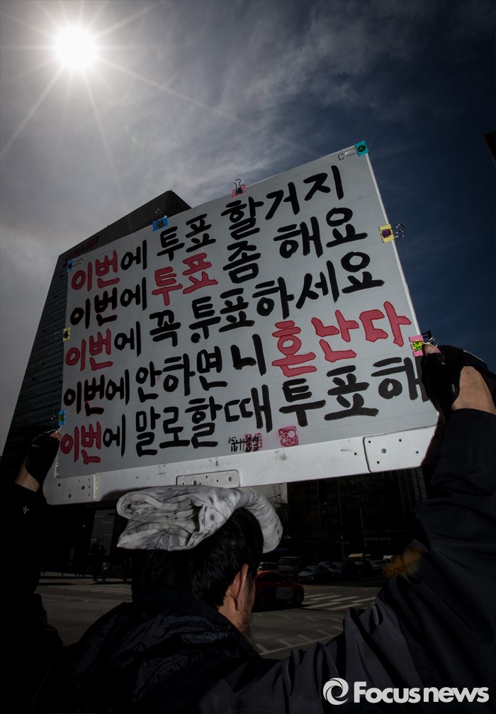 (서울=포커스뉴스) 4일 오후 서울 광화문광장에서 한 시민이 투표를 독려하는 손팻말을 들고 있다.