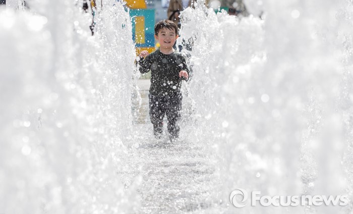 (서울=포커스뉴스) 4일 오후 서울 광화문광장 분수대에서 한 어린이가 물장난을 치고 있다.