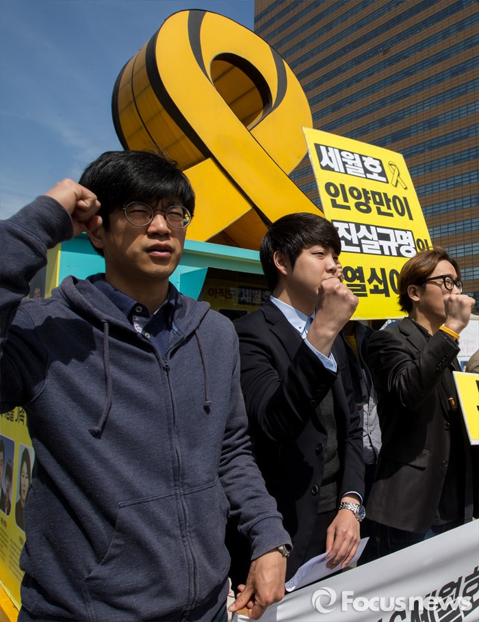 (서울=포커스뉴스) 4일 오후 서울 광화문광장에서 열린 4.16 세월호참사 2주기 대학생 준비위원회 발족식에 참석한 청년들이 특별법 개정을 촉구하는 구호를 외치고 있다.