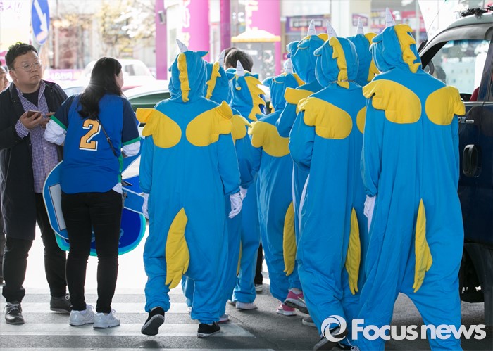 (용인=포커스뉴스) 4일 오후 경기도 이마트 죽전점 앞 광장에서 열린 더불어민주당 용인지역 합동유세에 인형옷을 입은 선거운동원들이 율동을 선보인 뒤 이동하고 있다.
