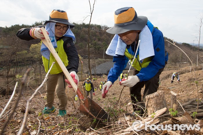 (세종=포커스뉴스) 김경환 국토교통부차관과 직원들이 식목일을 앞두고 4일 오후 세종시 금남면 영곡리 야산에서 나무심기를 하고 있다.
