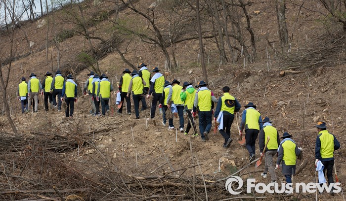 (세종=포커스뉴스) 김경환 국토교통부차관과 직원들이 식목일을 앞두고 4일 오후 세종시 금남면 영곡리 야산에서 나무심기를 하기 위해 이동하고 있다.