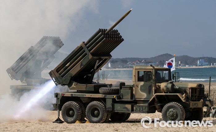 (고성=포커스뉴스) 4일 오후 강원도 고성 송지호해변에서 열린 '2016년 전반기 해상사격 훈련'에서 육군 8군단 포병대대 소속 130mm 다련장 구룡이 로켓탄을 발사하고 있다.