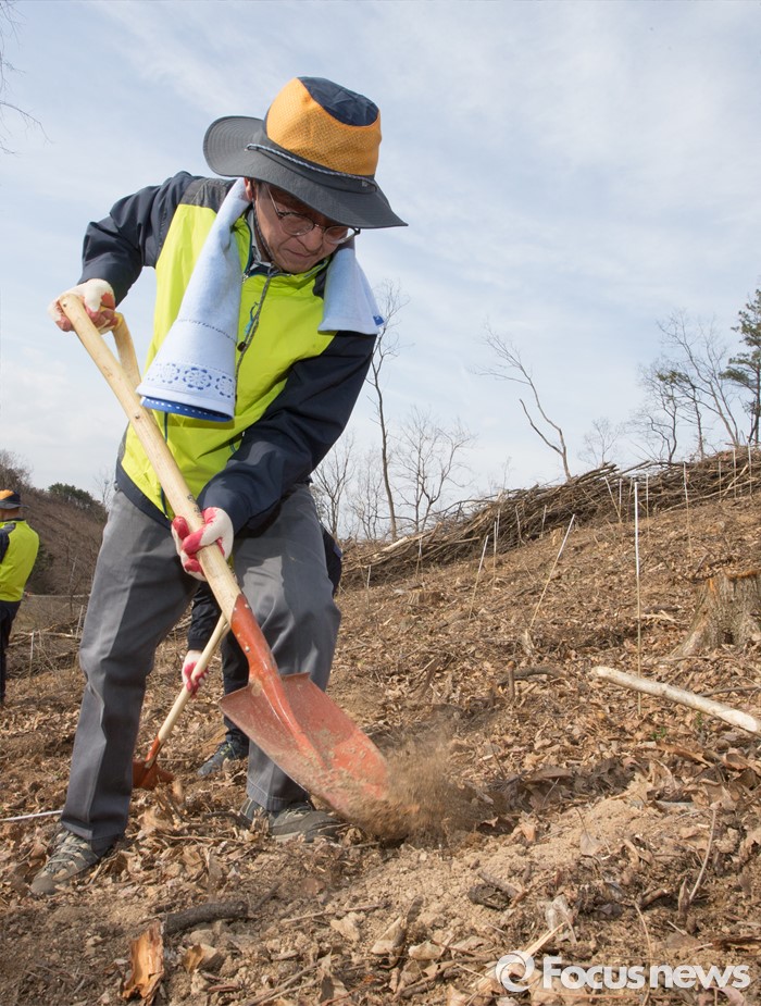 (세종=포커스뉴스) 김경환 국토교통부차관과 직원들이 식목일을 앞두고 4일 오후 세종시 금남면 영곡리 야산에서 나무심기를 하고 있다.