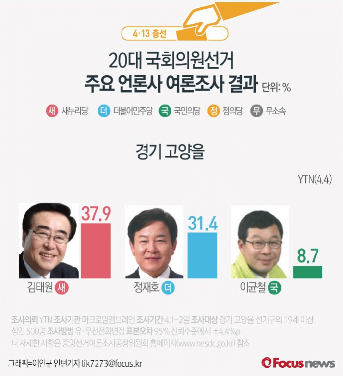 (서울=포커스뉴스) YTN이 여론조사기관 엠브레인에 의뢰해 4일 발표한 결과에 따르면 경기 고양을 후보 지지율은 새누리당 김태원 의원 37.9%, 더불어민주당 정재호 후보 31.4% 순으로 나타났다. 이어 국민의당 이균철 후보가 8.7%를 기록했다.