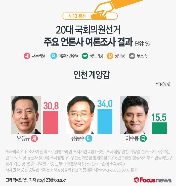 (서울=포커스뉴스) YTN이 마크로밀엠브레인에 의뢰해 4월1일부터 3일까지 인천 계양갑 선거구에 거주하는 유권자 500명을 대상으로 여론조사를 실시한 결과, 더민주 유동수 후보의 지지율은 34.0%, 새누리당 오성규 후보의 지지율은 30.8%인 것으로 나타났다. 국민의당 이수봉 후보의 지지율은 15.5%였다.