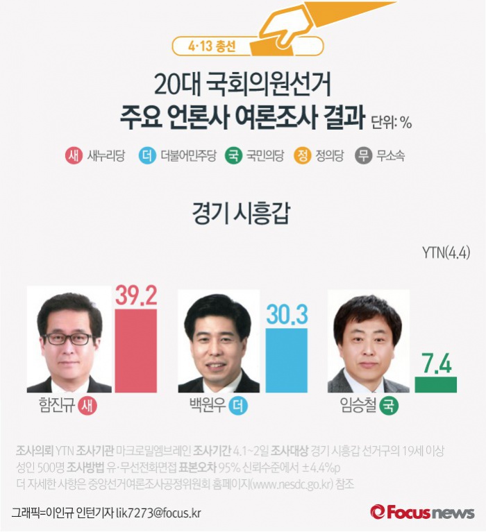 YTN이 여론조사기관 엠브레인에 의뢰해 4일 발표한 결과에 따르면 경기 시흥갑에서 함진규 의원 지지율은 39.2%로 더불어민주당 백원우 후보 지지율 30.3%보다 높았다.