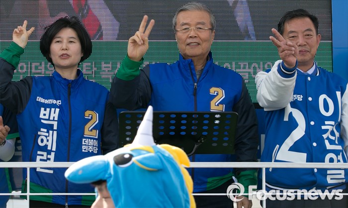 수원=포커스뉴스) 4일 오후 경기도 지하철 1호선 성균관대역 앞에서 열린 더불어민주당 수원지역 합동유세에 참석한 김종인(가운데) 비대위 대표 겸 선대위원장과 이찬열(오른쪽) 수원갑, 백혜련 수원을 후보가 지지를 호소하고 있다.