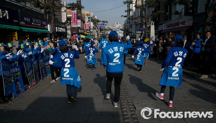 (수원=포커스뉴스) 4일 오후 경기도 수원 팔달문시장 앞에서 열린 더불어민주당 수원지역 합동유세에 참여한 김영진 수원병 후보의 유세단원들이 율동을 선보이고 있다.