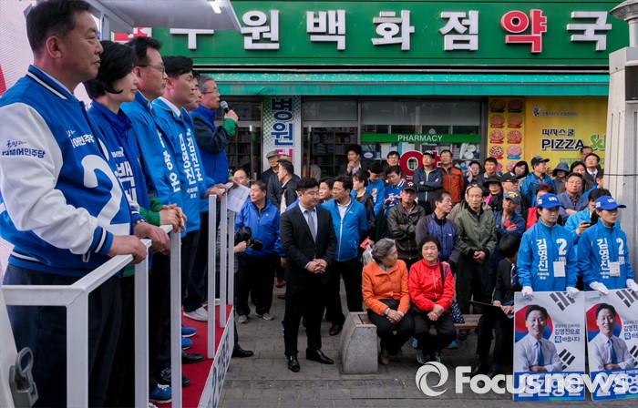 (수원=포커스뉴스) 4일 오후 경기도 수원 팔달문시장 앞에서 열린 더불어민주당 수원지역 합동유세에 참석한 김종인 비대위 대표 겸 선대위원장이 지지를 호소하고 있다. 왼쪽부터 이찬열 수원갑, 백혜련 수원을, 박광온 수원정, 김영진 수원병, 김진표 수원무 후보, 김 대표.