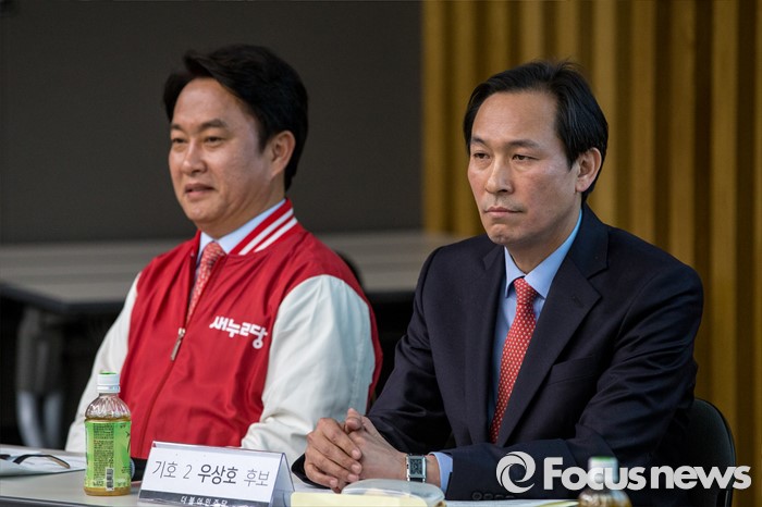 (서울=포커스뉴스) 더불어민주당 서대문갑 우상호(오른쪽) 후보와 새누리당 서대문갑 이상헌 후보가 4일 오후 서울 서대문구 연세대학교에서 열린 '제20대 국회의원 선거 서대문갑 후보자 토론회'에 참석해 토론 준비를 하고 있다.
