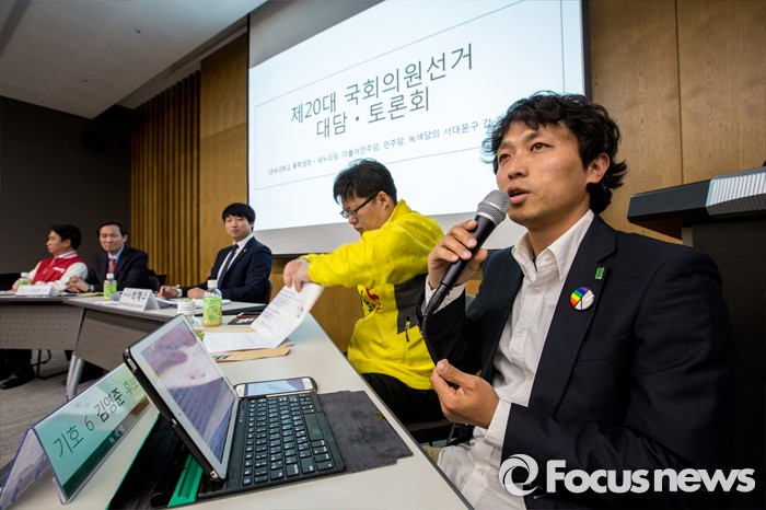 (서울=포커스뉴스) 녹색당 서대문갑 김영준 후보가 4일 오후 서울 서대문구 연세대학교에서 열린 '제20대 국회의원 선거 서대문갑 후보자 토론회'에 참석해 공약 발표를 하고 있다.