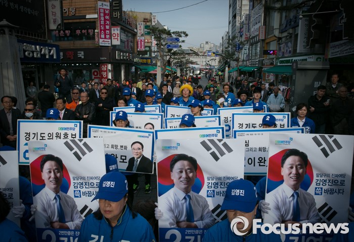 (수원=포커스뉴스) 4일 오후 경기도 수원 팔달문시장 앞에서 열린 더불어민주당 수원지역 합동유세에 참여한 선거운동원들이 지지를 호소하고 있다.