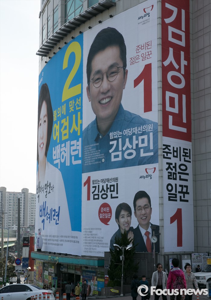 (수원=포커스뉴스) 4일 오후 경기도 수원시 한 건물에 20대 총선 경기 수원을에 출마하는 김상민 새누리당 후보와 백혜련 더불어민주당 후보의 현수막이 나란히 붙어 있다.