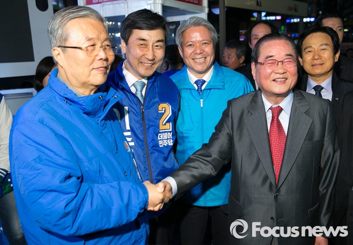 (안양=포커스뉴스) 4일 오후 경기도 지하철 1호선 안양역 앞 광장에서 선거유세를 마친 김종인 더불어민주당 비대위 대표 겸 선대위원장과 안양 만안구 후보인 이종걸 원내대표 등 인사들이 취재진을 향해 포즈를 취하고 있다. 왼쪽부터 김 대표, 이 후보, 최대호 전 안양시장, 이 후보의 사촌형 이종찬 전 국정원장.