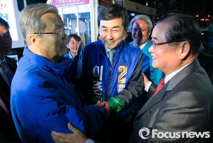 (안양=포커스뉴스) 4일 오후 경기도 지하철 1호선 안양역 앞 광장에서 선거유세를 마친 김종인(왼쪽) 더불어민주당 비대위 대표 겸 선대위원장과 안양 만안구 후보인 이종걸(가운데) 원내대표, 이 원내대표의 사촌형 이종찬 전 국정원장이 인사하고 있다.