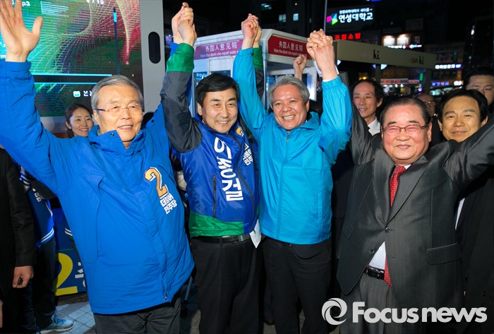 (안양=포커스뉴스) 4일 오후 경기도 지하철 1호선 안양역 앞 광장에서 선거유세를 마친 김종인 더불어민주당 비대위 대표 겸 선대위원장과 안양 만안구 후보인 이종걸 원내대표 등 인사들이 취재진을 향해 포즈를 취하고 있다. 왼쪽부터 김 대표, 이 후보, 최대호 전 안양시장, 이 후보의 사촌형 이종찬 전 국정원장.