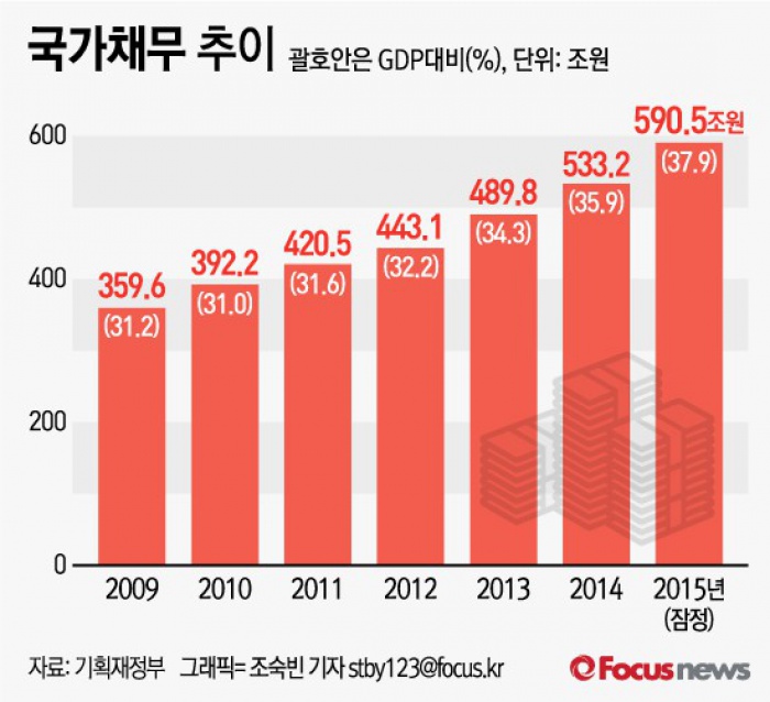 (서울=포커스뉴스) 국가 채무(D1, 중앙정부+지방정부)가 전년 대비 53조5000억원 늘어난 590조5000억원으로 집계됐다. 이는 국내총생산(GDP) 대비 37.9% 수준으로 매년 상승하는 추세다.