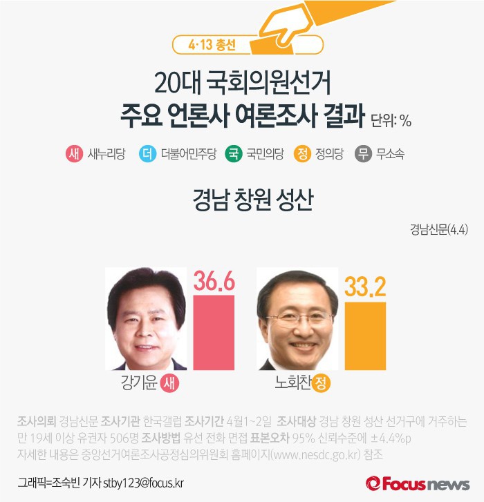 (서울=포커스뉴스) 경남신문이 여론조사기관 한국갤럽에 의뢰해 4일 발표한 결과에 따르면 새누리당 강기윤 후보의 지지율은 36.6%, 정의당 노회찬 후보의 지지율은 33.2%로 오차범위내 접전을 벌이고 있는 것으로 나타났다.