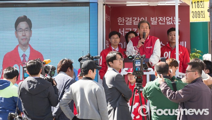 (대전=포커스뉴스) 김무성 새누리당 대표 최고위원이 5일 오전 대전 서구 한민시장 일원에서 이영규 후보의 지지를 호소하고 있다.