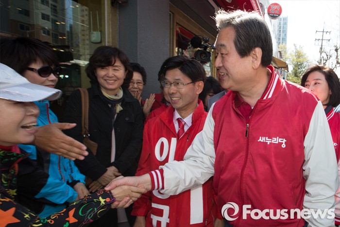 (대전=포커스뉴스) 김무성 새누리당 대표 최고위원이 5일 오전 대전 서구 한민시장 일원에서 이영규 후보의 지지를 호소하며 시민과 악수하고 있다.