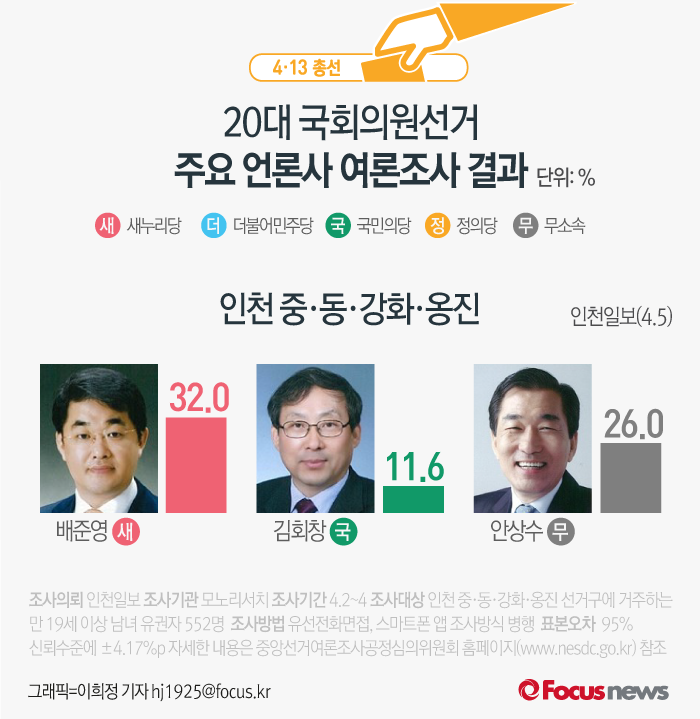 (서울=포커스뉴스) 인천일보가 모노리서치에 의뢰해 5일 발표한 여론조사 결과에 따르면 새누리당 배준영 후보의 지지율은 32.0%, 무소속 안상수 후보는 26.0%, 국민의당 김회창 후보는 11.6%를 기록했다.