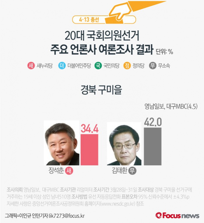 (서울=포커스뉴스) 영남일보와 대구MBC가 공동으로 여론조사기관 리얼미터에 의뢰해 5일 발표한 결과에 따르면 무소속 김태환 의원은 42.0%, 새누리당 장석춘 후보는 34.4%를 기록했다.
