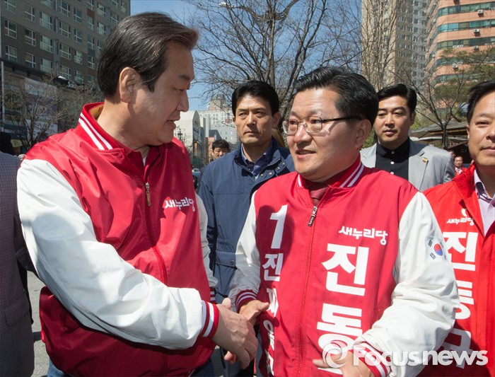 (대전=포커스뉴스) 김무성 새누리당 대표가 5일 오전 대전 유성구 족욕체험장 일원에서 지원유세를 마치고 진동규 후보와 악수하고 있다.