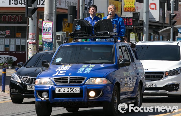 (아산=포커스뉴스) 5일 오전 충남 아산시 배방읍사무소 앞 인근 거리에서 김종인(오른쪽) 더불어민주당 비대위 대표 겸 선대위원장과 강훈식 아산을 후보가 유세를 마친 뒤 차량에 올라 지지를 호소하고 있다.