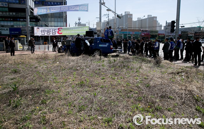 (아산=포커스뉴스) 5일 오전 충남 아산시 배방읍사무소 앞 사거리에서 김종인 더불어민주당 비대위 대표 겸 선대위원장이 강훈식 아산을 후보의 지지를 호소하고 있다.
