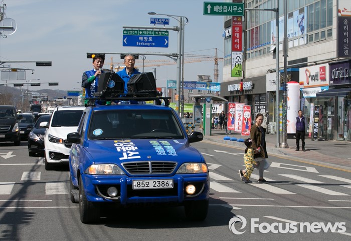 (아산=포커스뉴스) 5일 오전 충남 아산시 배방읍사무소 앞 인근 거리에서 김종인(오른쪽) 더불어민주당 비대위 대표 겸 선대위원장과 강훈식 아산을 후보가 유세를 마친 뒤 차량에 올라 지지를 호소하고 있다.