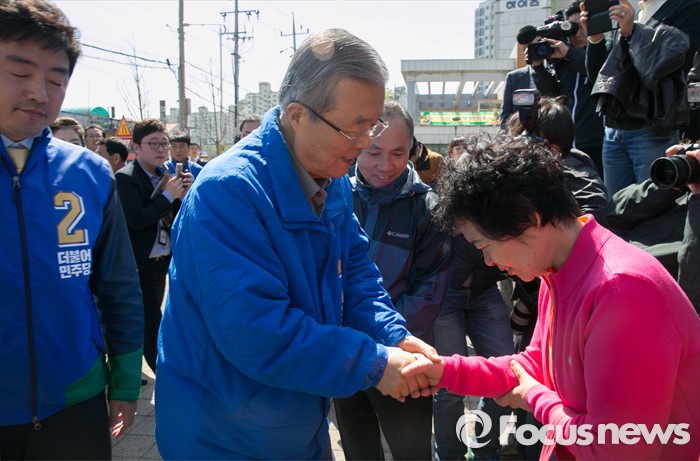 (아산=포커스뉴스) 5일 오전 충남 아산시 배방읍사무소 앞 사거리에서 김종인(가운데) 더불어민주당 비대위 대표 겸 선대위원장과 강훈식 아산을 후보가 유세를 마친 뒤 시민 및 지지자들과 인사하며 지지를 호소하고 있다.