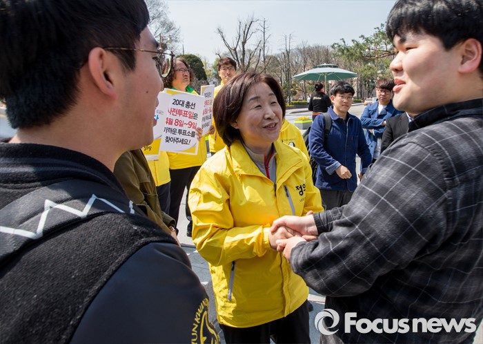 (서울=포커스뉴스) 5일 오전 서울 종로구 성균관대학교 정문 앞에서 윤공규 종로구 후보 지원유세에 나선 심상정 정의당 상임선거대책위원장이 대학생들과 악수하고 있다.
