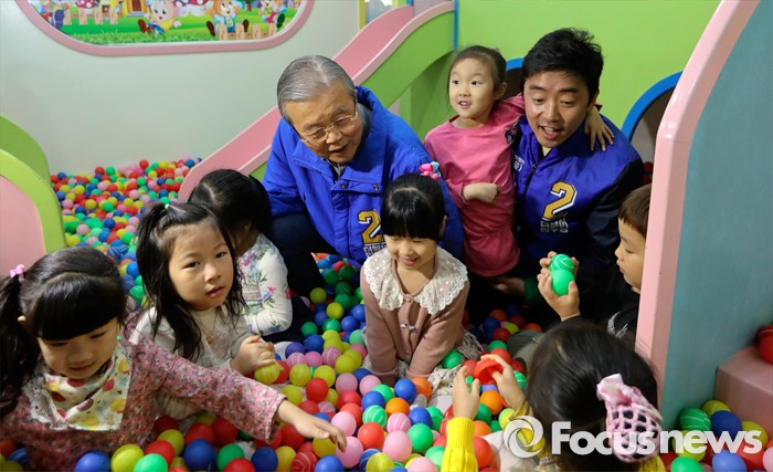 (아산=포커스뉴스) 김종인(가운데) 더불어민주당 비대위 대표 겸 선대위원장과 강훈식(오른쪽) 충남 아산을 후보가 5일 오전 충남 아산시 진성어린이집을 방문해 어린이들과 볼풀장에서 즐거운 시간을 보내고 있다.