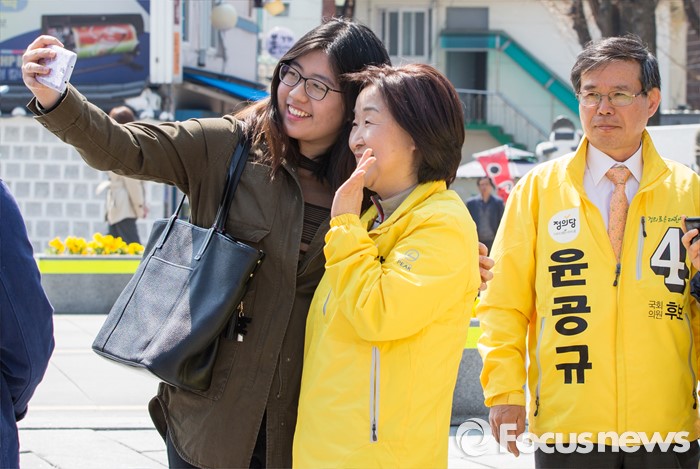 (서울=포커스뉴스) 5일 오전 서울 종로구 성균관대학교 정문 앞에서 윤공규 종로구 후보 지원유세에 나선 심상정 정의당 상임선거대책위원장이 대학생과 셀카를 찍고 있다.
