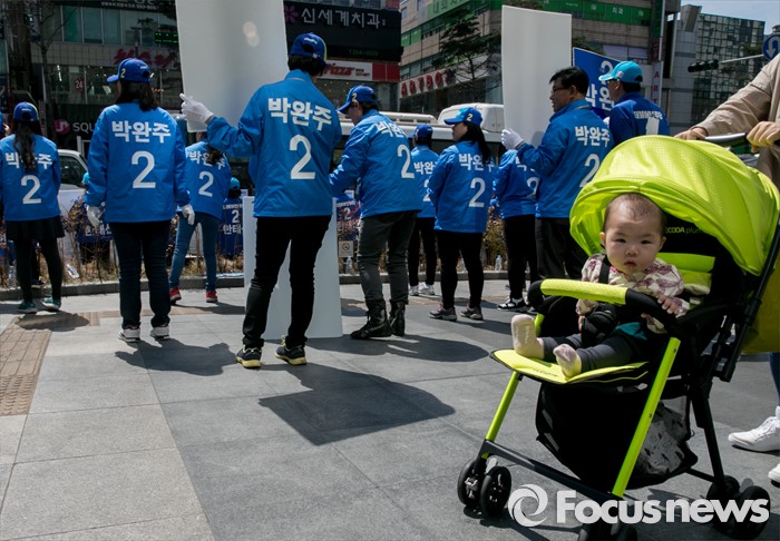 (천안=포커스뉴스) 5일 오전 충남 천안시 신세계백화점 앞에서 열린 더불어민주당 천안지역 합동유세에 참여한 선거운동원들이 지지를 호소하고 있다.