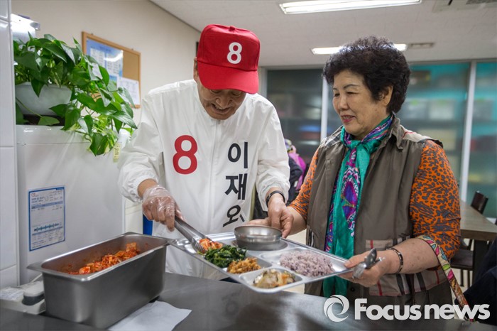 (서울=포커스뉴스) 은평을 무소속 이재오 후보가 5일 오전 서울 은평구 불광노인복지관에서 어르신들에게 점심배식을 하며 유세를 하고 있다.