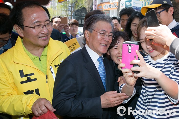 (창원=포커스뉴스) 문재인(가운데) 전 더불어민주당 대표가 5일 오후 경남 창원시 성산구 반송시장에서 노회찬(왼쪽) 정의당 창원성산 후보 지원유세 중, 시민들과 기념사진을 찍고 있다. 노 후보는 창원성산에서 허성무 더불어민주당 후보와 경합에서 승리해, 더민주 · 정의당 단일후보로 출마한다.
