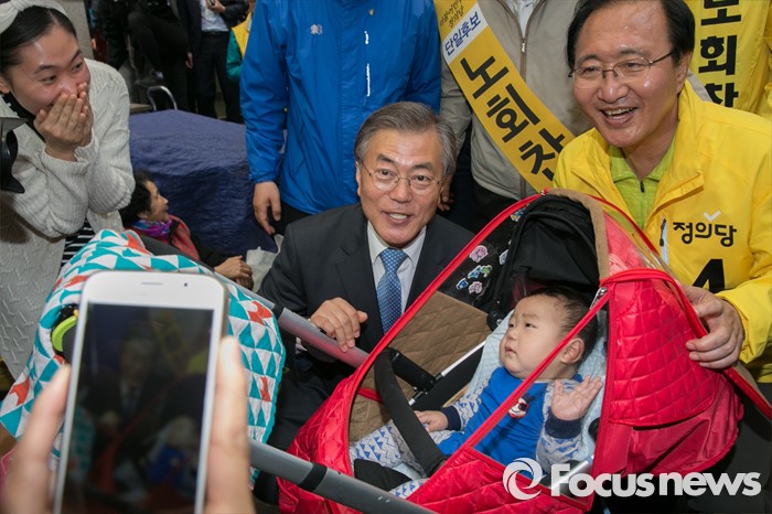 (창원=포커스뉴스) 문재인(오른쪽 두번째) 전 더불어민주당 대표가 5일 오후 경남 창원시 성산구 반송시장에서 노회찬(오른쪽) 정의당 창원성산 후보 지원유세 중, 어린이와 기념사진을 찍고 있다. 노 후보는 창원성산에서 허성무 더불어민주당 후보와 경합에서 승리해, 더민주 · 정의당 단일후보로 출마한다.