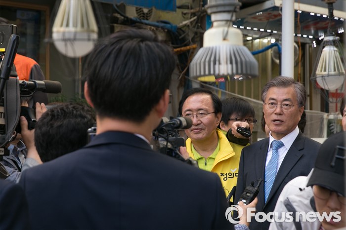 (창원=포커스뉴스) 문재인(오른쪽) 전 더불어민주당 대표가 5일 오후 경남 창원시 성산구 반송시장에서 노회찬(가운데) 정의당 창원성산 후보 지원유세를 마친 뒤, 인터뷰를 하고 있다. 노 후보는 창원성산에서 허성무 더불어민주당 후보와 경합에서 승리해, 더민주 · 정의당 단일후보로 출마한다.