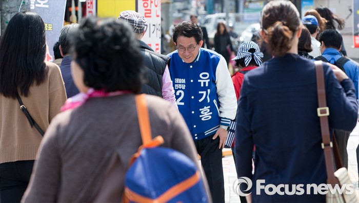 (서울=포커스뉴스) 5일 오후 서울 관악구 서울대입구역 인근에서 유기홍 더불어민주당 관악구갑 후보가 선거유세를 하고 있다.