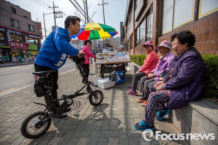 (서울=포커스뉴스) 김영호 더불어민주당 서대문을 후보가 5일 오후 서울 서대문구 백련시장 일대에서 자전거를 타고 주민들을 만나며 한 표를 호소 하고 있다.