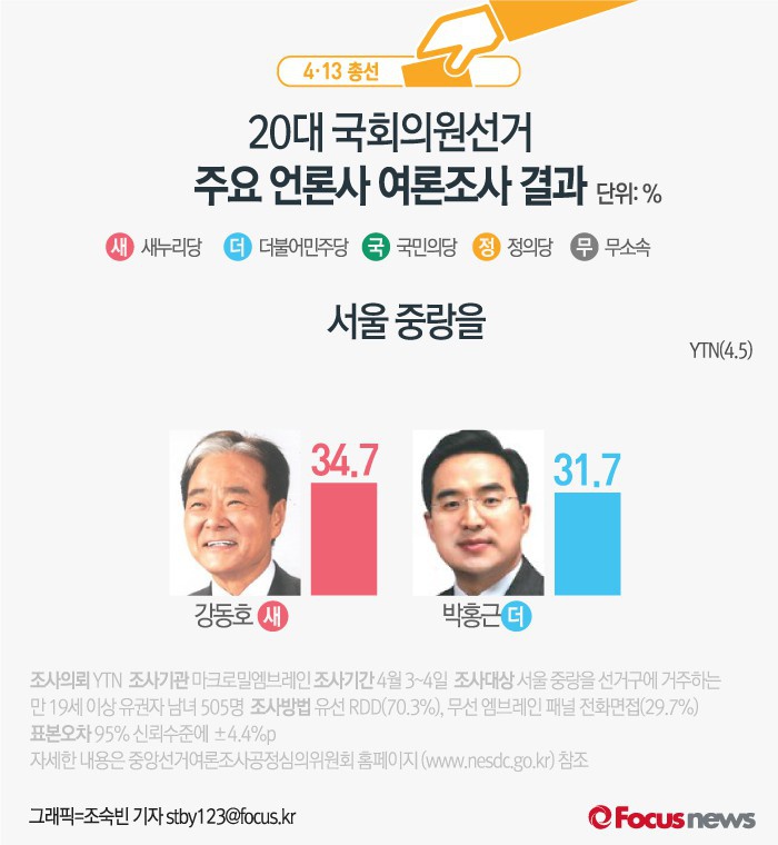 (서울=포커스뉴스) YTN이 여론조사기관 엠브레인에 의뢰해 5일 발표한 결과에 따르면 후보지지도는 새누리당 강동호 후보(34.7%), 더민주 박홍근 후보(31.7%) 순인 것으로 조사됐다.