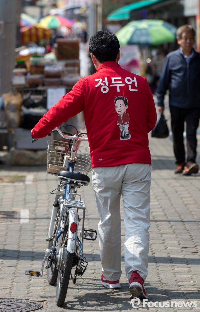 | △ 자전거 유세 펼치는 정두언 후보 |