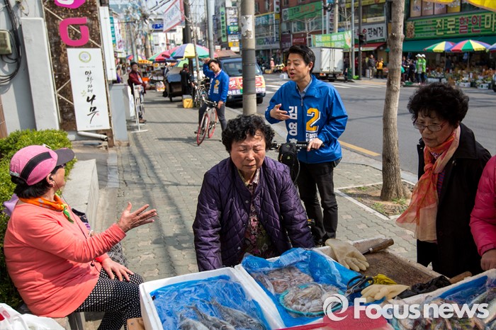 (서울=포커스뉴스) 김영호 더불어민주당 서대문을 후보가 5일 오후 서울 서대문구 백련시장 일대에서 자전거를 타고 주민들을 만나며 한 표를 호소 하고 있다.