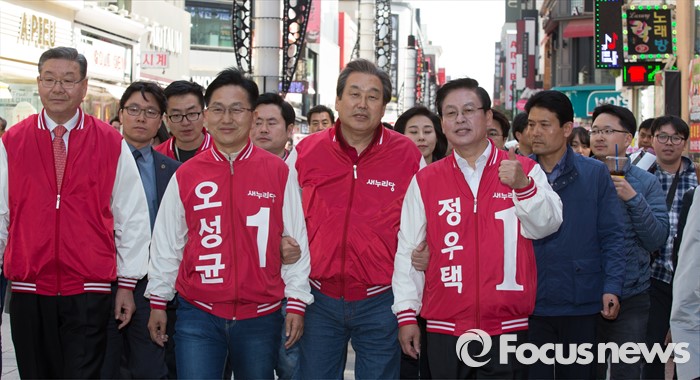 (청주=포커스뉴스) 김무성 새누리당 대표가 5일 오후 충북 청주 성안길에서 정우택, 최현호, 오성균 후보의 지지를 호소하고 있다.