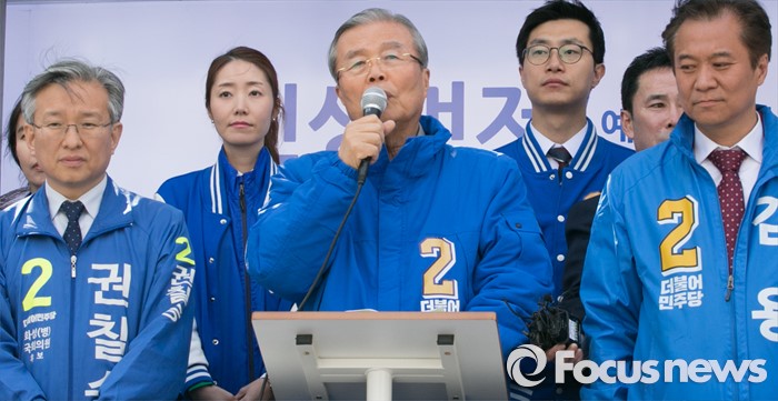 (화성=포커스뉴스) 5일 오후 경기도 화성 봉담읍 하나로마트 앞에서 열린 더불어민주당 화성지역 합동유세에 참석한 김종인 비대위 대표 겸 선대위원장이 지지를 호소하고 있다. 왼쪽부터 권칠승 화성병 후보, 김 대표, 김용 화성갑 후보.