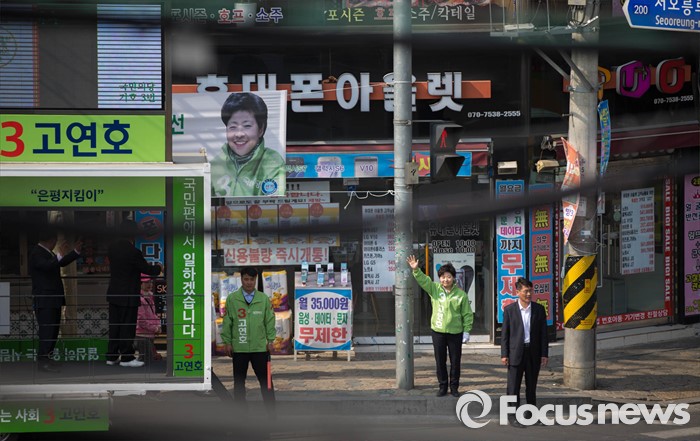 (서울=포커스뉴스) 국민의당 은평을 고연호 후보가 5일 오후 서울 은평구 갈현동 인근에서 유세를 하고 있다.