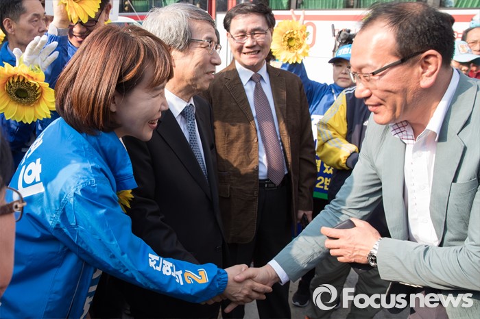 (서울=포커스뉴스) 20대 총선에 출마한 전현희 더불어민주당 강남을 후보가 5일 오후 서울 수서역 인근에서 전 후보의 고문으로 활동하기로 한 정운찬 전 국무총리와 함께 유권자들에게 지지를 호소하고 있다.